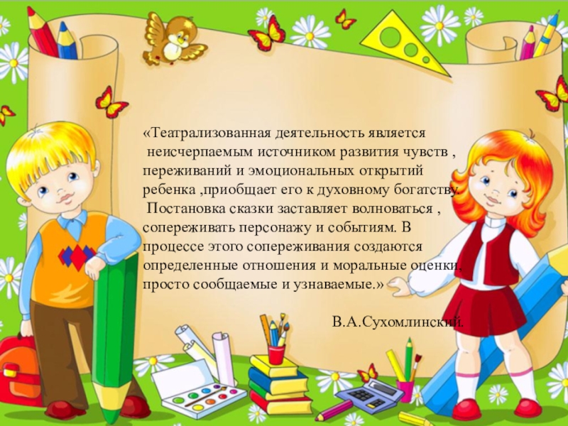 Постановка сказки заставляет волноваться , сопереживать персонажу и событиям. В процессе этого сопереживания создаются определенные отношения и моральные оценки, просто сообщаемые и узнаваемые.»