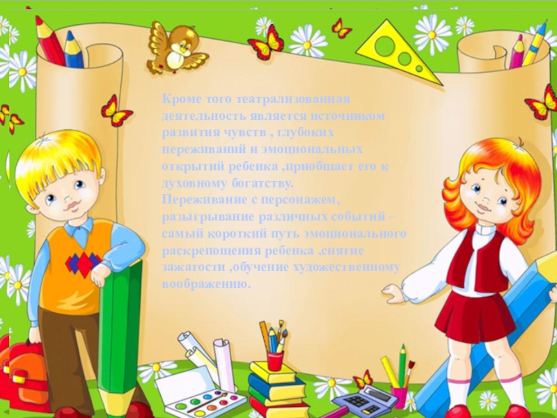 Переживание с персонажем, разыгрывание различных событий –самый короткий путь эмоционального раскрепощения ребенка ,снятие зажатости ,обучение художественному воображению.