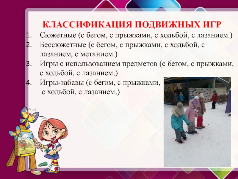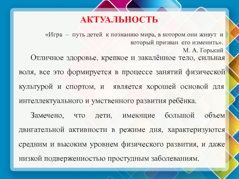 Замечено, что дети, имеющие большой объем двигательной активности в режиме дня, характеризуются средним и высоким уровнем физического развития, и даже низкой подверженностью простудным заболеваниям.