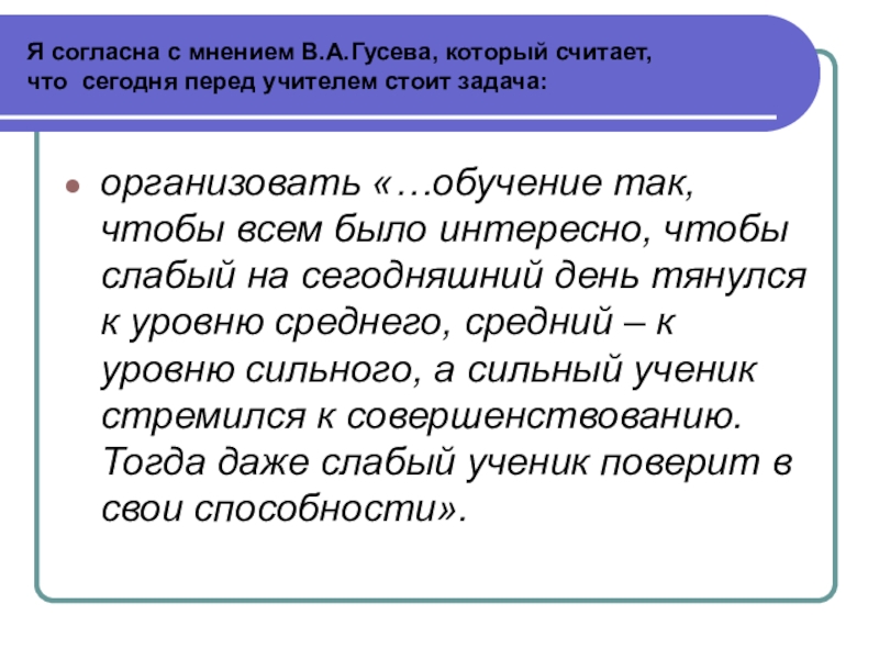 организовать «…обучение так, чтобы всем было интересно, чтобы слабый на сегодняшний день тянулся к уровню среднего, средний – к уровню сильного, а сильный ученик стремился к совершенствованию. Тогда даже слабый ученик поверит в свои способности».
