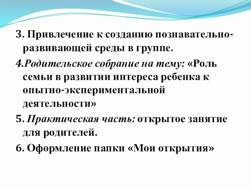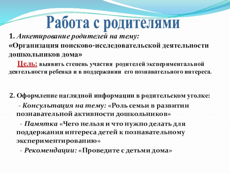Цель: выявить степень участия родителей экспериментальной деятельности ребенка и в поддержании его познавательного интереса.