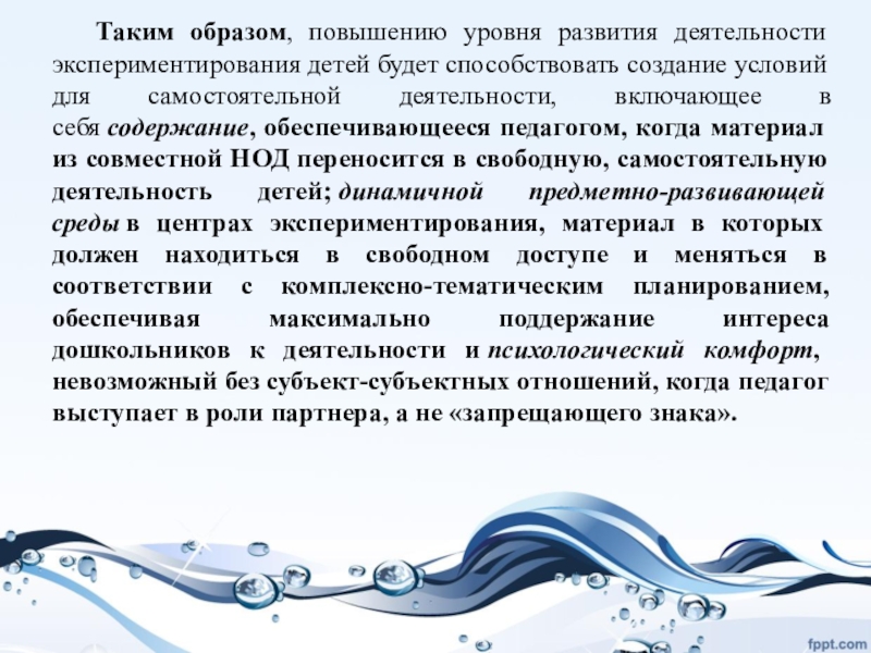 Слайд 13 Таким образом, повышению уровня развития деятельности экспериментирования детей будет способствовать создание