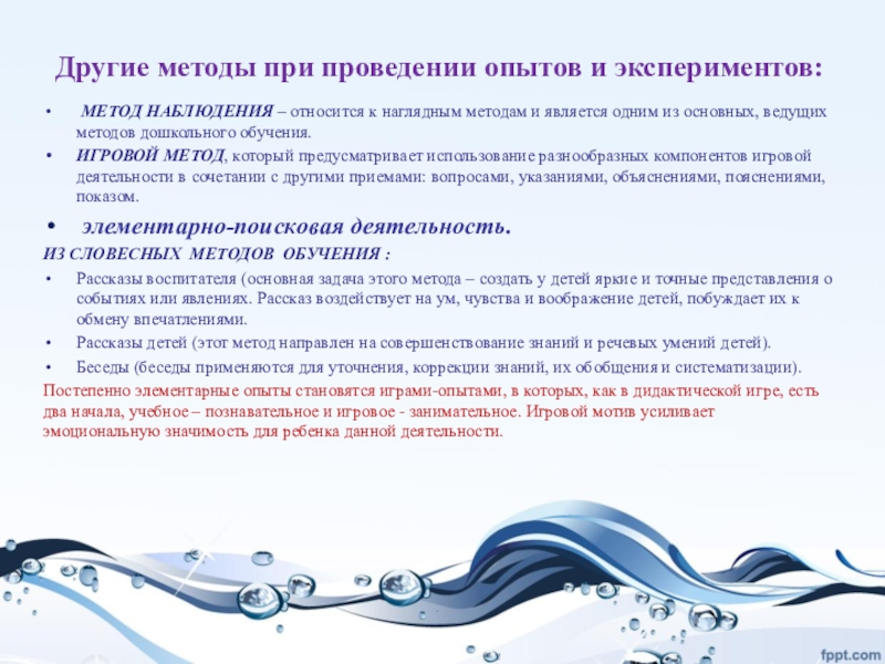 Слайд 11Другие методы при проведении опытов и экспериментов: