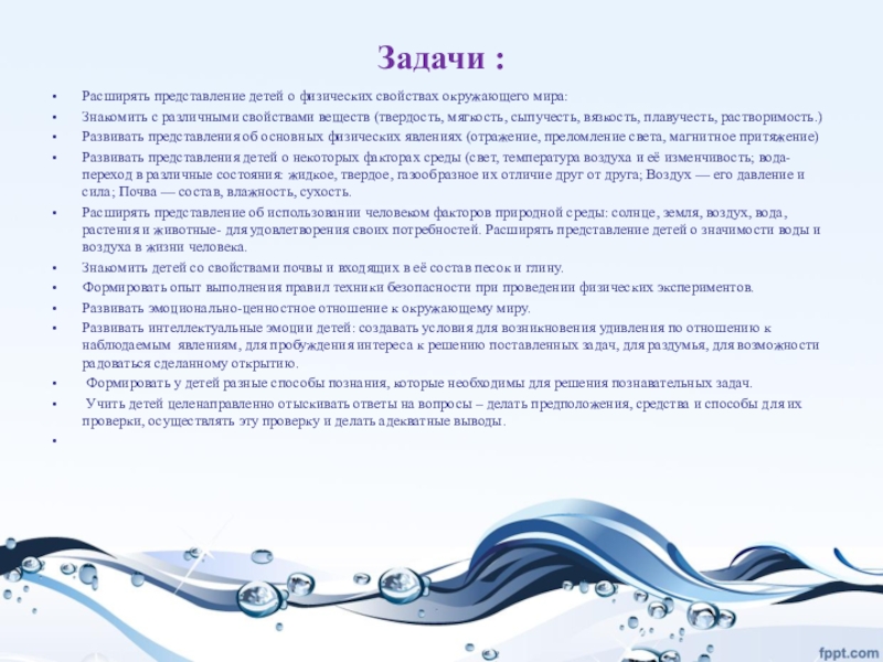 Развивать представления детей о некоторых факторах среды (свет, температура воздуха и её изменчивость; вода-переход в различные состояния: жидкое, твердое, газообразное их отличие друг от друга; Воздух — его давление и сила; Почва — состав, влажность, сухость.