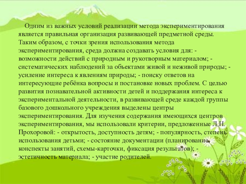 экспериментирования является правильная организация развивающей предметной среды. Таким образом, с точки зрения использования метода экспериментирования, среда должна создавать условия для: - возможности действий с природным и рукотворным материалом; - систематических наблюдений за объектами живой и неживой природы; - усиление интереса к явлениям природы; - поиску ответов на интересующие ребёнка вопросы и постановке новых проблем. С целью развития познавательной активности детей и поддержания интереса к экспериментальной деятельности, в развивающей среде каждой группы базового дошкольного учреждения выделены центры экспериментирования. Для изучения содержания имеющихся центров экспериментирования, мы использовали критерии, предложенные Л.Н. Прохоровой: - открытость, доступность детям; - популярность, степень использования детьми; - состояние документации (планирование, конспекты занятий, схемы-карточки, фиксация результатов); - эстетичность материала; - участие родителей.