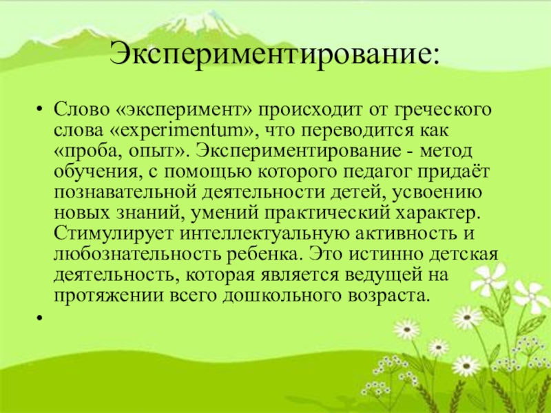 опыт». Экспериментирование - метод обучения, с помощью которого педагог придаёт познавательной деятельности детей, усвоению новых знаний, умений практический характер. Стимулирует интеллектуальную активность и любознательность ребенка. Это истинно детская деятельность, которая является ведущей на протяжении всего дошкольного возраста.