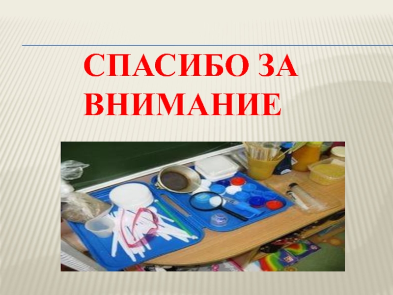 Посуда: Ёмкости разного объёма, сито, пластиковые стаканы, воронки, колбочки, соломинки, ложки, термос, металлическая крышка, баночка для тушения свечи, металлическая подставка, металлическая ёмкость, сосуды, пластиковые бутылочки, тёрка, тазики.