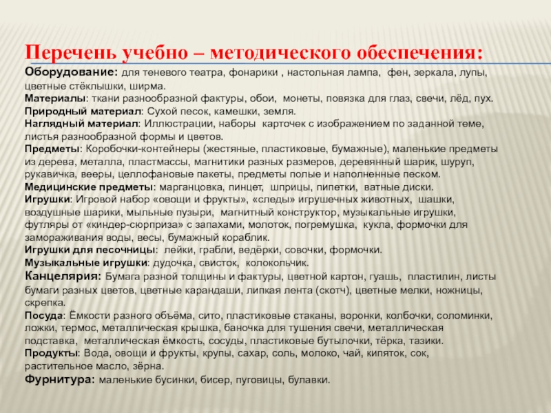 Игрушки: Игровой набор «овощи и фрукты», «следы» игрушечных животных, шашки, воздушные шарики, мыльные пузыри, магнитный конструктор, музыкальные игрушки, футляры от «киндер-сюрприза» с запахами, молоток, погремушка, кукла, формочки для замораживания воды, весы, бумажный кораблик.