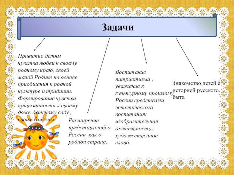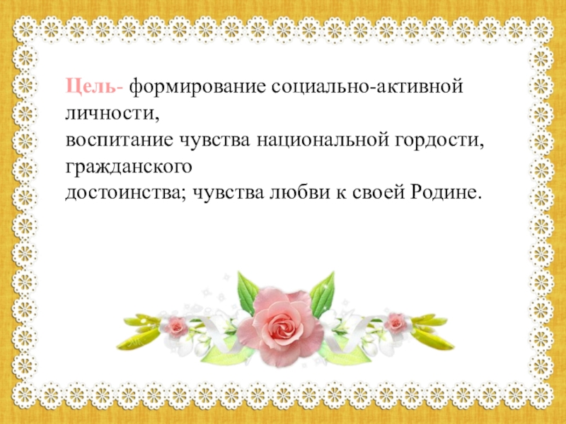 Привитие детям чувства любви к своему родному краю, своей малой Родине на основе приобщения к родной культуре и традиции.