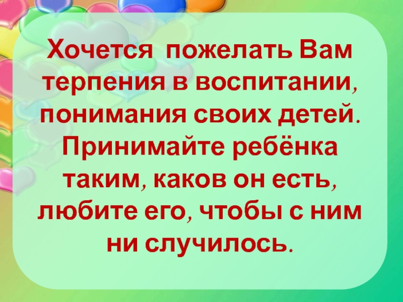 Слайд 8Хочется пожелать Вам терпения в воспитании, понимания своих детей. Принимайте ребёнка