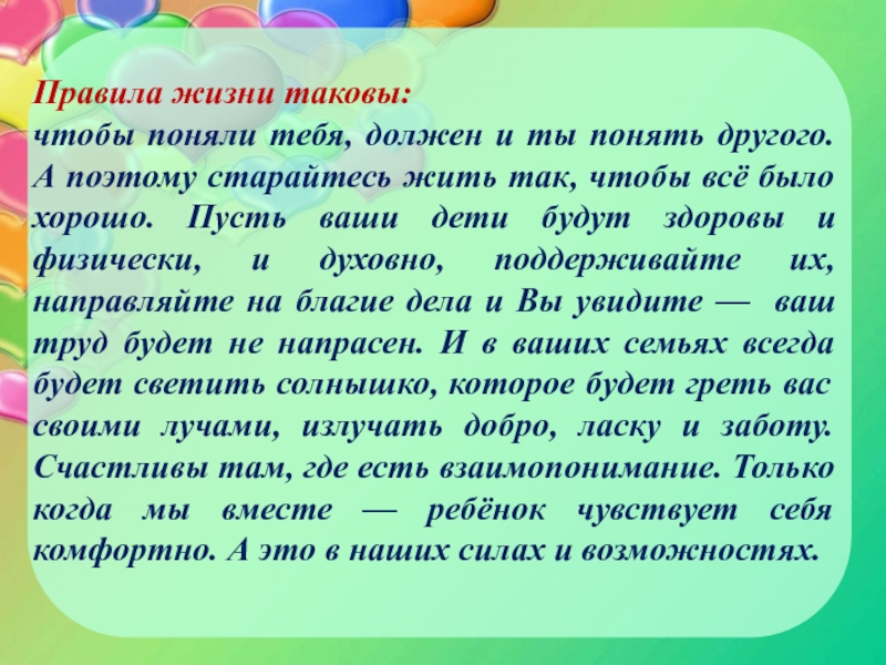 А поэтому старайтесь жить так, чтобы всё было хорошо. Пусть ваши дети будут здоровы и физически, и духовно, поддерживайте их, направляйте на благие дела и Вы увидите — ваш труд будет не напрасен. И в ваших семьях всегда будет светить солнышко, которое будет греть вас своими лучами, излучать добро, ласку и заботу. Счастливы там, где есть взаимопонимание. Только когда мы вместе — ребёнок чувствует себя комфортно. А это в наших силах и возможностях.