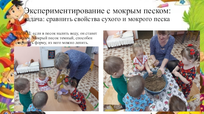 Экспериментирование с мокрым песком: задача: сравнить свойства сухого и мокрого пескаВЫВОД: если в песок налить воду, он