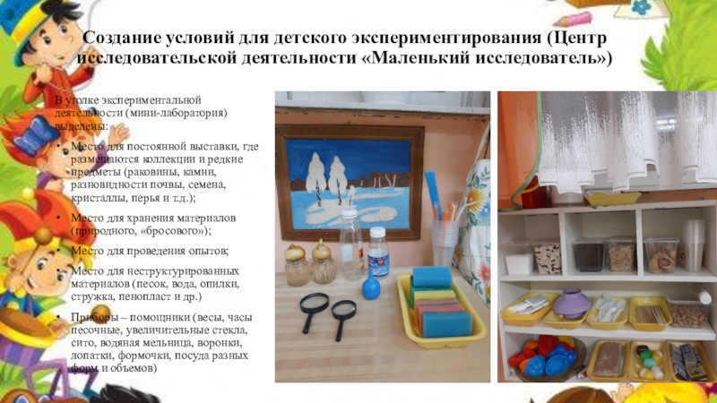 Слайд 6Создание условий для детского экспериментирования (Центр исследовательской деятельности «Маленький исследователь»)