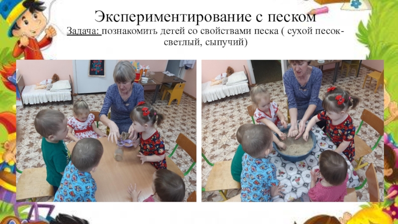 Слайд 7 Экспериментирование с песком Задача: познакомить детей со свойствами песка ( сухой песок-