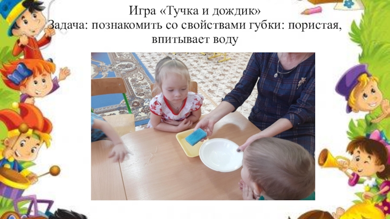 Слайд 20Игра «Тучка и дождик» Задача: познакомить со свойствами губки: пористая, впитывает воду