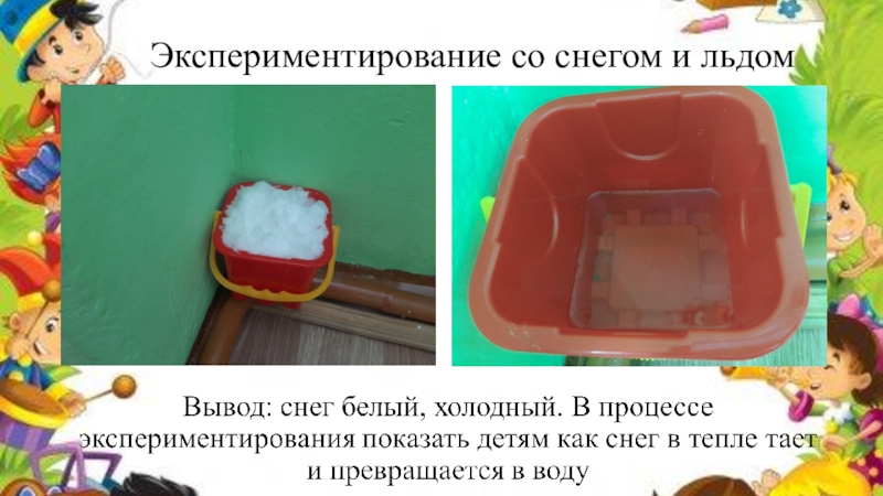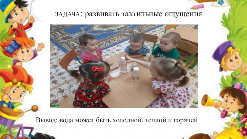 ЗАДАЧА: развивать тактильные ощущенияВывод: вода может быть холодной, теплой и горячей