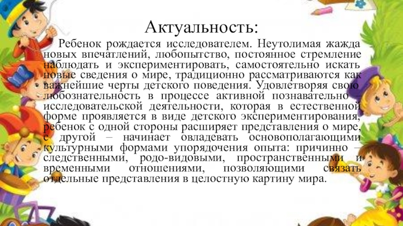 Актуальность: Ребенок рождается исследователем. Неутолимая жажда новых впечатлений, любопытство, постоянное стремление наблюдать и экспериментировать, самостоятельно искать новые сведения о мире, традиционно рассматриваются как важнейшие черты детского поведения. Удовлетворяя свою любознательность в процессе активной познавательно – исследовательской деятельности,