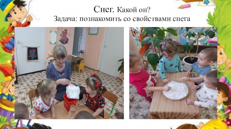 Слайд 22Снег. Какой он? Задача: познакомить со свойствами снега