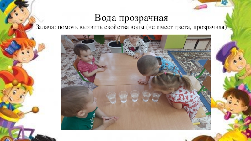 Вода прозрачная Задача: помочь выявить свойства воды (не имеет цвета, прозрачная)