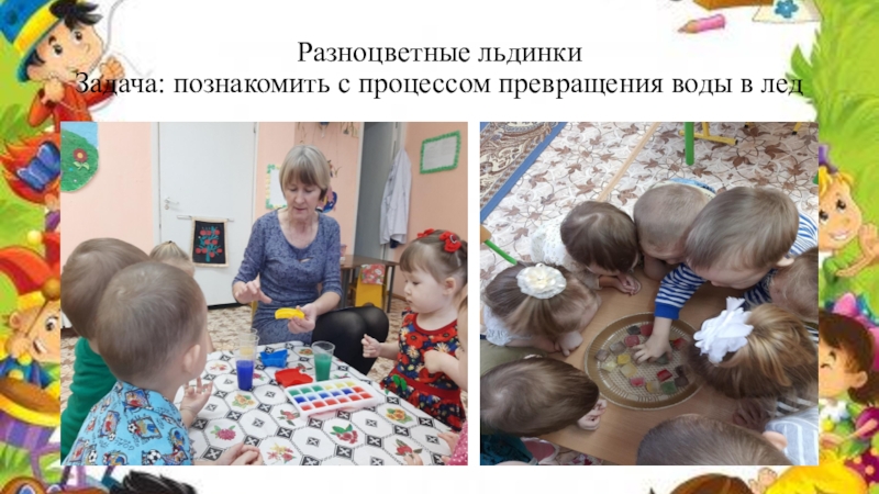 Слайд 23Разноцветные льдинки Задача: познакомить с процессом превращения воды в лед