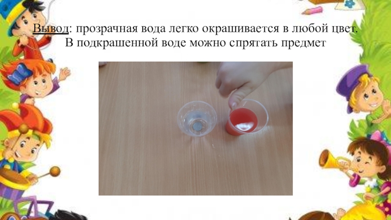Вывод: прозрачная вода легко окрашивается в любой цвет. В подкрашенной воде можно спрятать предмет