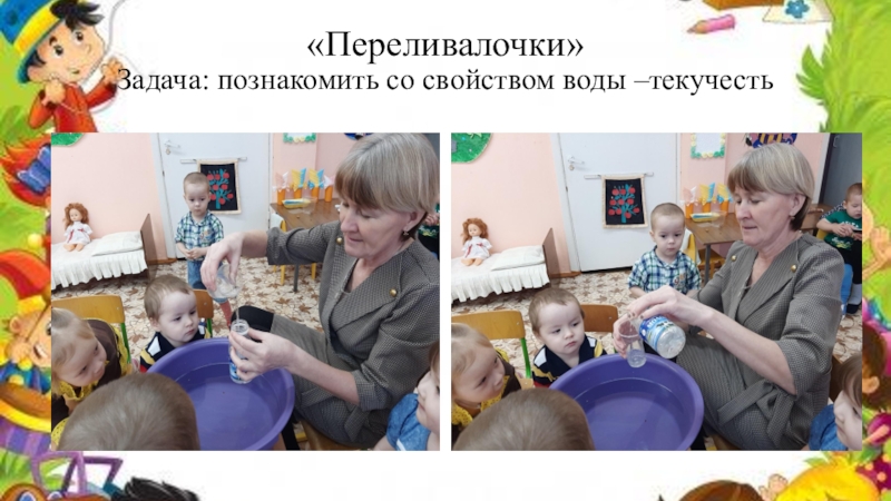 Слайд 15 «Переливалочки» Задача: познакомить со свойством воды –текучесть