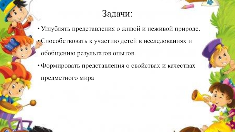 Задачи:Углублять представления о живой и неживой природе.Способствовать к участию детей в исследованиях и обобщению результатов опытов.Формировать представления