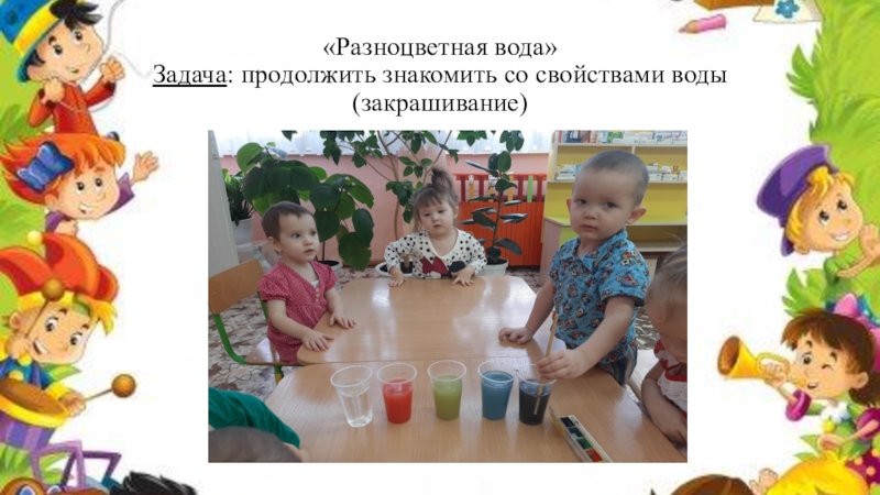 Слайд 18«Разноцветная вода» Задача: продолжить знакомить со свойствами воды (закрашивание)