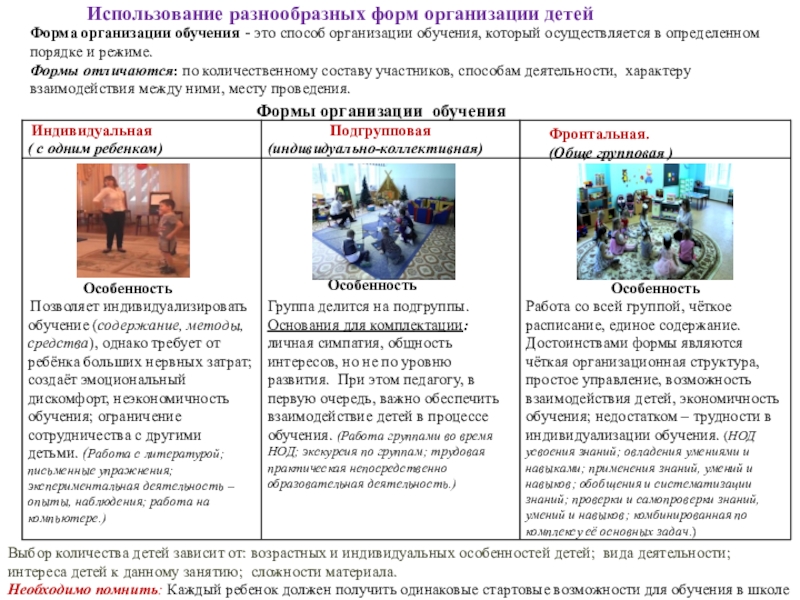 которой будет организована работа с отобранным материалом, то как будет осуществлена смена видов деятельности. Главное при группировке — умение найти такую форму организации занятия, которая вызовет повышенную активность детей, а не пассивное восприятие нового
