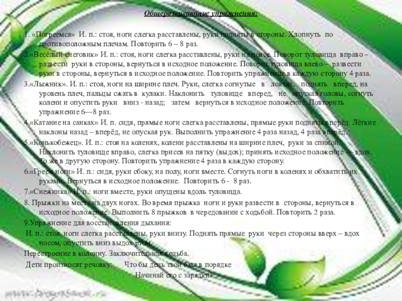 1. «Погреемся» И. п.: стоя, ноги слегка расставлены, руки