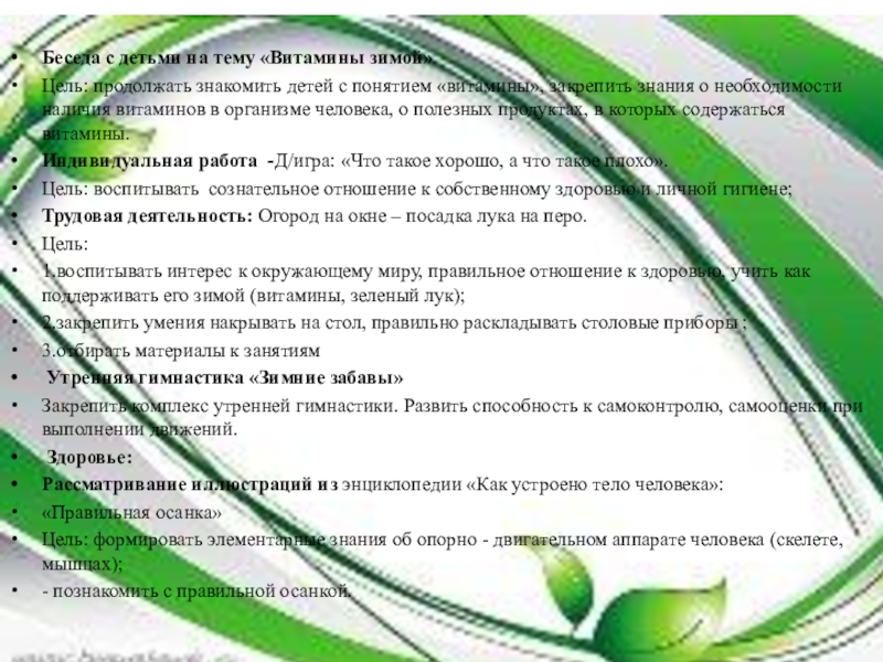 1.воспитывать интерес к окружающему миру, правильное отношение к здоровью, учить как поддерживать его зимой (витамины, зеленый лук);