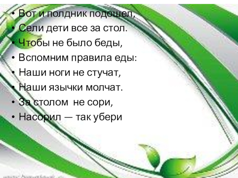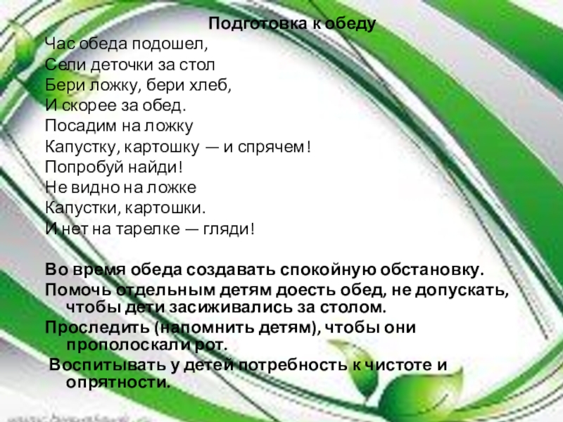 Помочь отдельным детям доесть обед, не допускать, чтобы дети засиживались за столом.