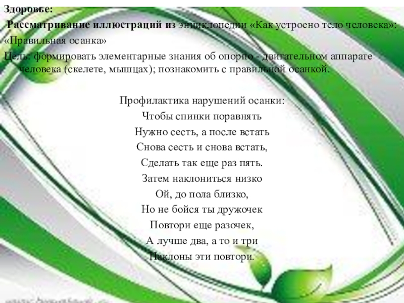 элементарные знания об опорно - двигательном аппарате человека (скелете, мышцах); познакомить с правильной осанкой.