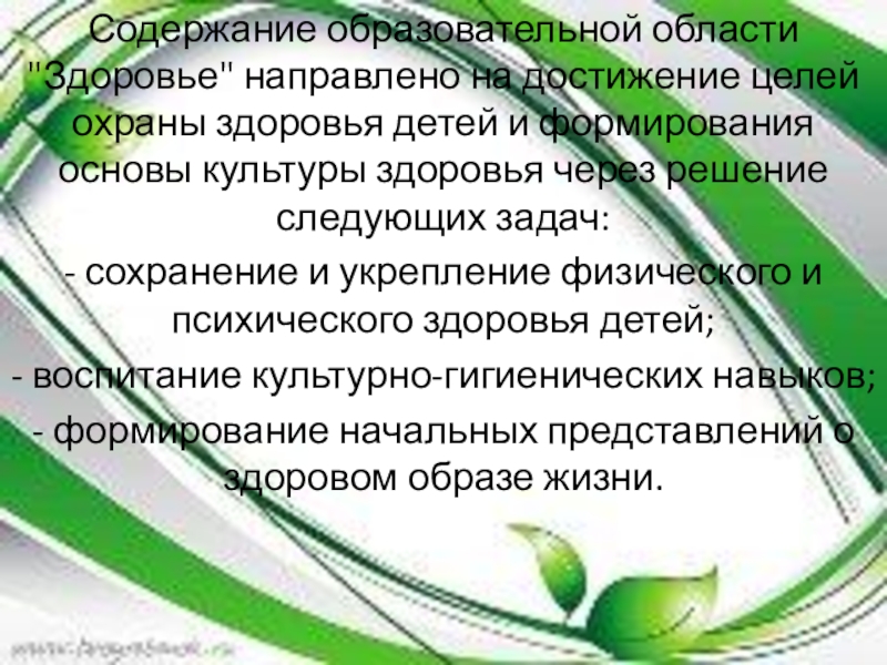 Слайд 2Содержание образовательной области "Здоровье" направлено на достижение целей охраны здоровья детей и