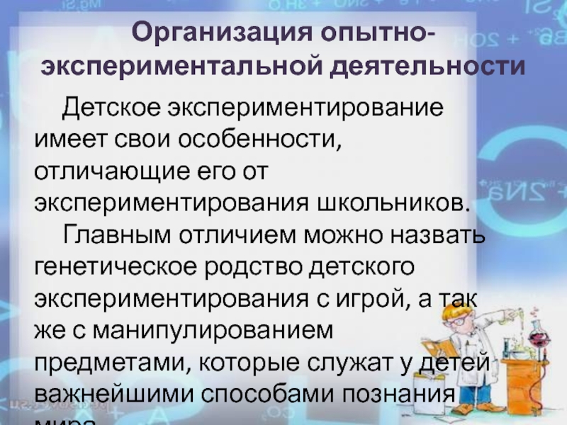 Детское экспериментирование имеет свои особенности, отличающие его от