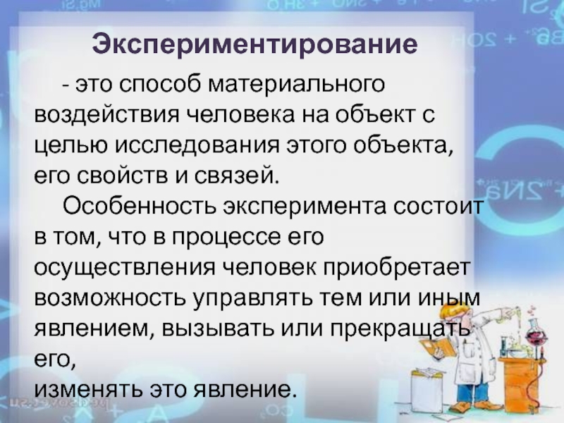 Особенность эксперимента состоит в том, что в процессе его осуществления человек приобретает возможность управлять тем или иным явлением, вызывать или прекращать его,