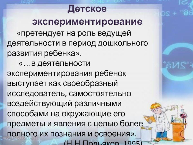 «…в деятельности экспериментирования ребенок выступает как своеобразный исследователь, самостоятельно воздействующий различными способами на окружающие его предметы и явления с целью более полного их познания и освоения».