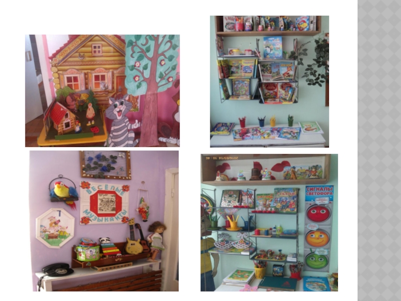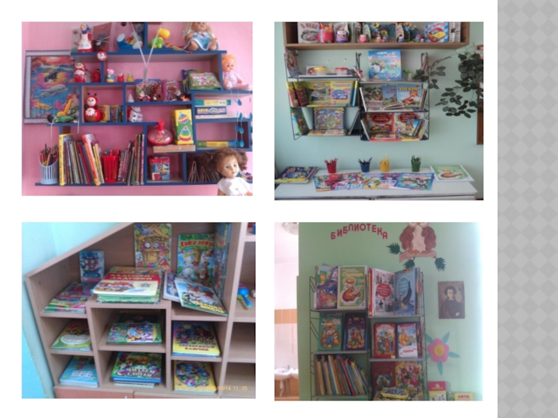 * книжные уголки - речевые игры ,энциклопедии, художественная литература, кубики и т.д.