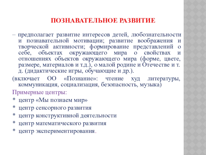 интересов детей, любознательности и познавательной мотивации; развитие воображения и творческой активности; формирование представлений о себе, объектах окружающего мира о свойствах и отношениях объектов окружающего мира (форме, цвете, размере, материалов и т.д.), о малой родине и Отечестве и т.д. (дидактические игры, обучающие и др.).