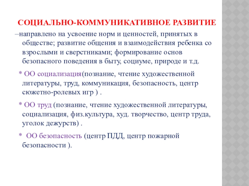 * ОО социализация(познание, чтение художественной литературы, труд, коммуникация, безопасность, центр сюжетно-ролевых игр ) .
