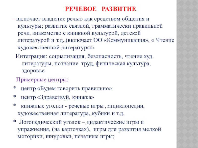 культуры; развитие связной, грамматически правильной речи, знакомство с книжной культурой, детской литературой и т.д.,(включает ОО «Коммуникация», « Чтение художественной литературы»