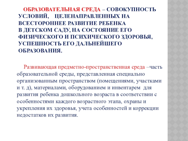 Развивающая предметно-пространственная среда –часть образовательной среды, представленная специально организованным пространством (помещениями, участками и т. д), материалами, оборудованием и инвентарем для развития ребенка дошкольного возраста в соответствии с особенностями каждого возрастного этапа, охраны и укрепления их здоровья, учета особенностей и коррекции недостатков их развития.