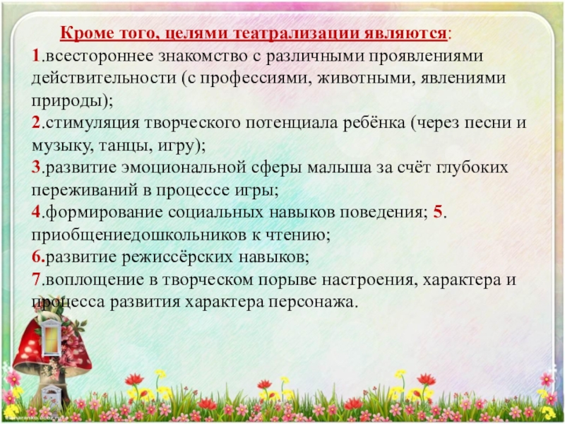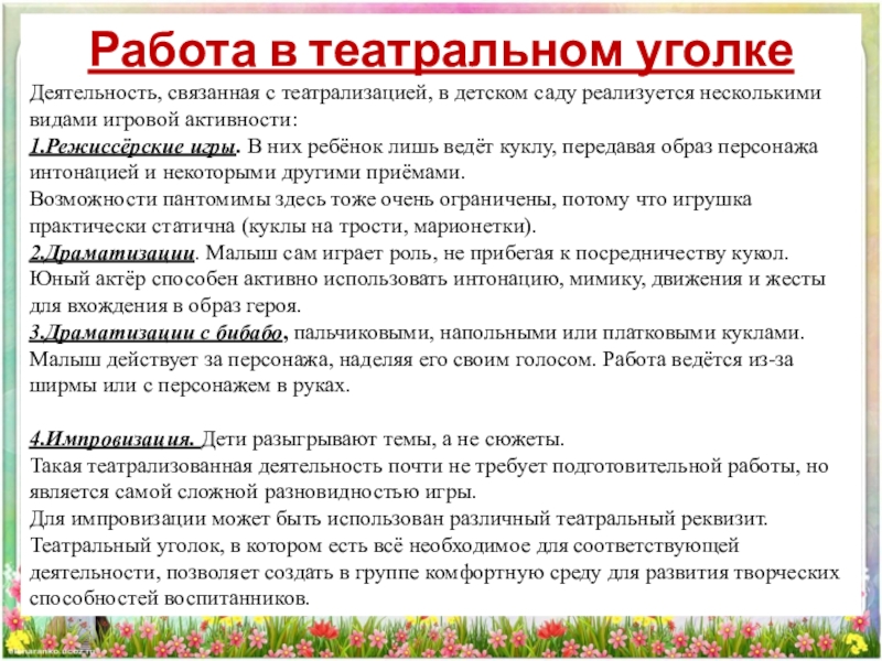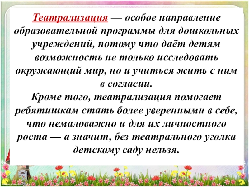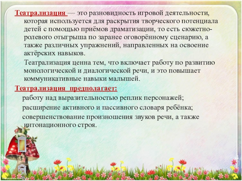 Слайд 22Театрализация — особое направление образовательной программы для дошкольных учреждений, потому что