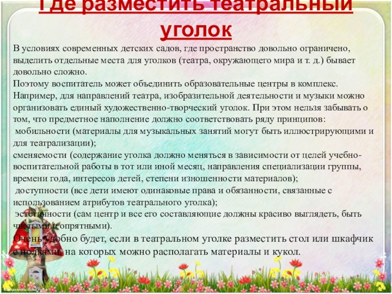 ограничено, выделить отдельные места для уголков (театра, окружающего мира и т. д.) бывает довольно сложно.