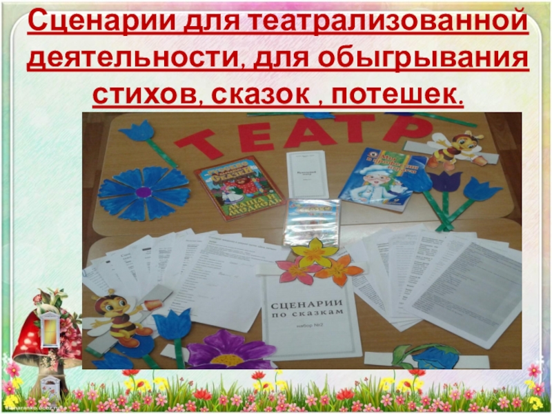 Слайд 19Сценарии для театрализованной деятельности, для обыгрывания стихов, сказок , потешек.