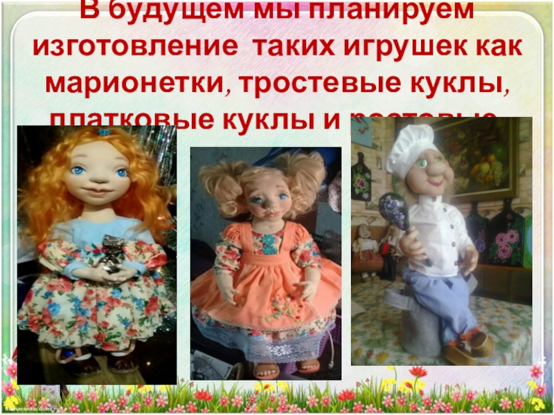 Слайд 20В будущем мы планируем изготовление таких игрушек как марионетки, тростевые куклы,
