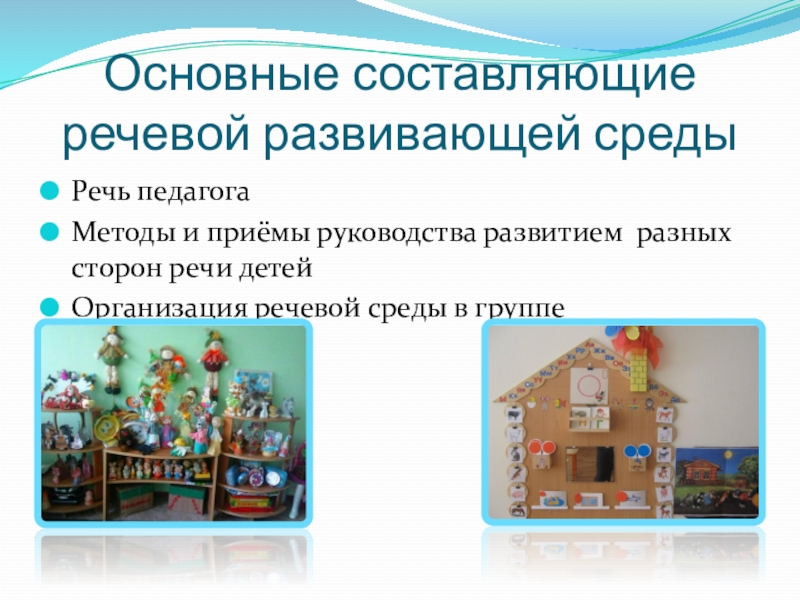 Основные составляющие речевой развивающей средыРечь педагогаМетоды и приёмы руководства развитием разных сторон речи детейОрганизация речевой среды в