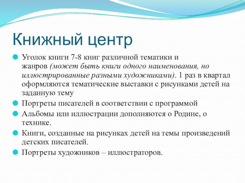 Книжный центрУголок книги 7-8 книг различной тематики и жанров (может быть книги одного наименования, но иллюстрированные разными художниками).