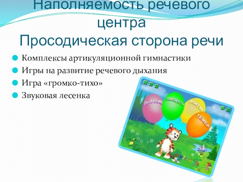 Наполняемость речевого центра Просодическая сторона речиКомплексы артикуляционной гимнастикиИгры на развитие речевого дыханияИгра «громко-тихо»Звуковая лесенка