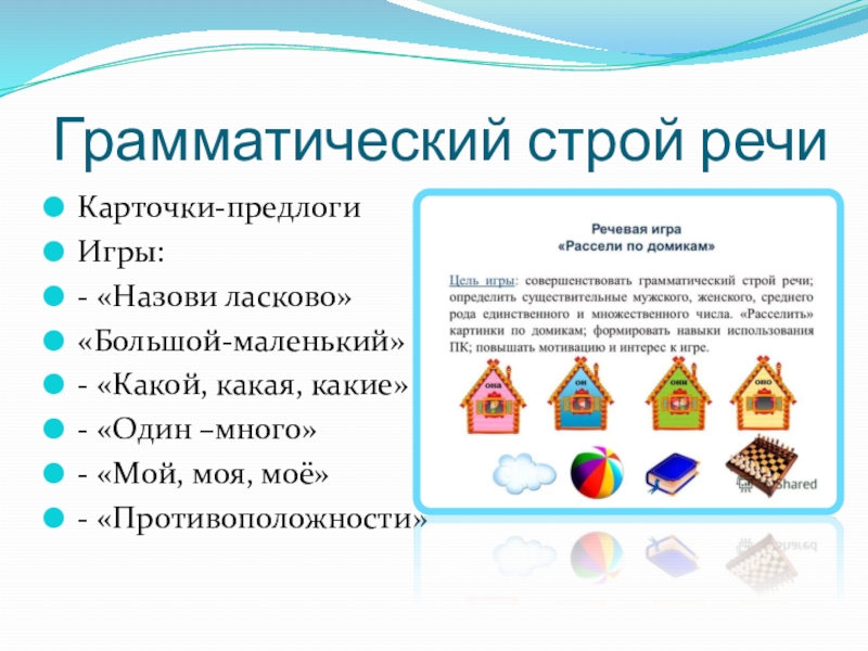 Грамматический строй речиКарточки-предлогиИгры: - «Назови ласково»«Большой-маленький»- «Какой, какая, какие»- «Один –много»- «Мой, моя, моё»- «Противоположности»